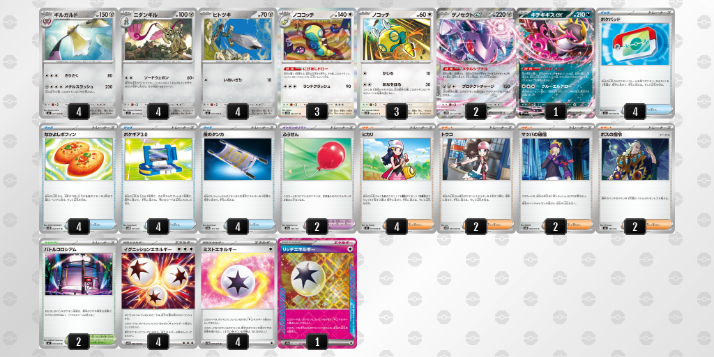 本デッキは、手札にある「ヒトツキ・ニダンギル・ギルガルド」の枚数に応じて威力が跳ね上がるワザ「ソードウェポン」での一撃必殺を狙う構築です。