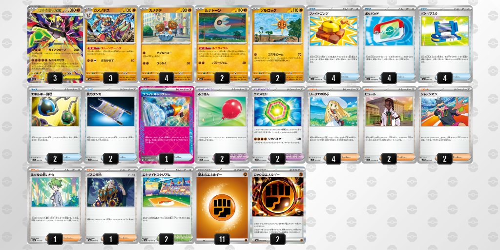 【デッキの運用と安定化】 エネルギー供給の要は、特性「ストーンアームズ」を持つガメノデス。基本闘エネルギーを厚めに採用し、ルナトーンのドロー加速と合わせて、重いワザを早期に起動させる安定感を追求しています。また、サイド管理も徹底しており、キチキギスex等の負け筋となる「2枚取り」されるポケモンを排除。相手に「高耐久のメガジガルデexを2匹倒さなければ勝てない」という苦しいプランを強いる構築です。
