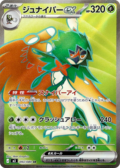 ワザ「ジェットブロー」は破格の1エネ120ダメージ+ベンチ狙撃50ダメージ。特性を持っていないためサポート「セイジ」を使えば後1からでもワザが打てる。