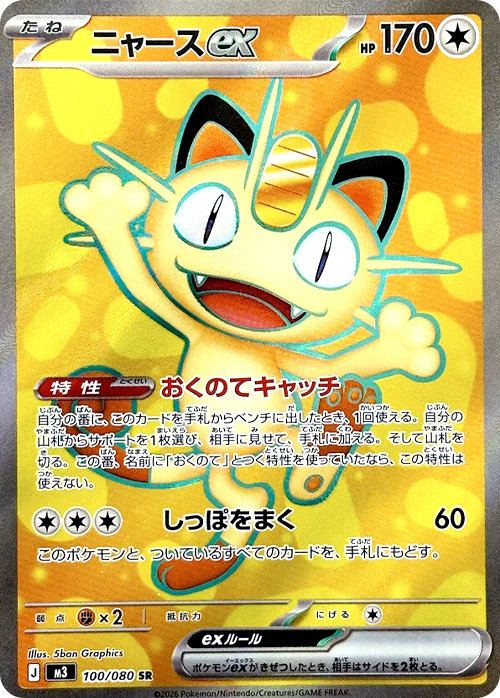 - ニャースex(1枚):サポートを手札に加えられる特性「おくのてキャッチ」が強力。デッキに1枚は欲しい。