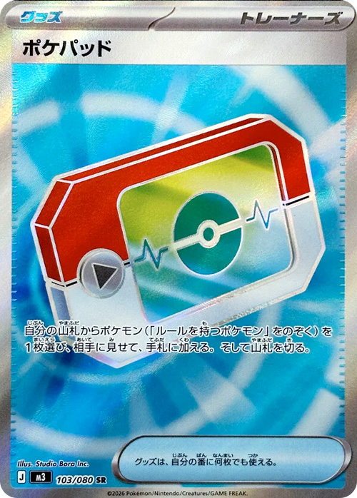 グッズ「ポケパッド」は、ルールを持たないポケモンを山札から1枚手札に加えることのできる強力なカード。スタートデッキにて初登場の汎用性の高いカードがムニキスゼロで無事再録!