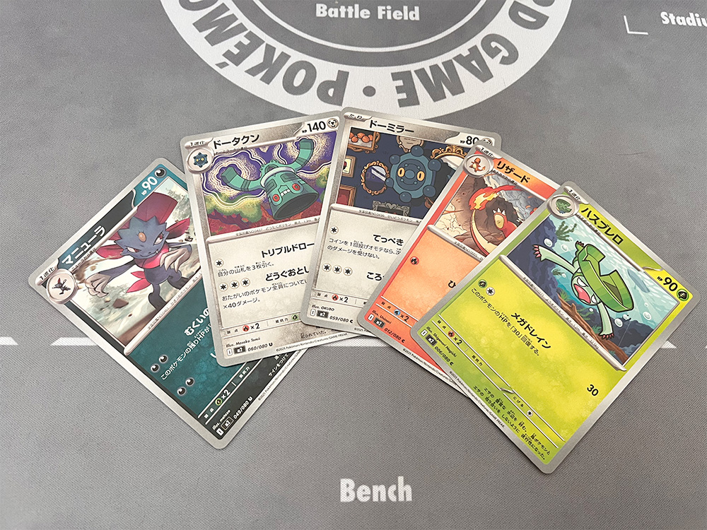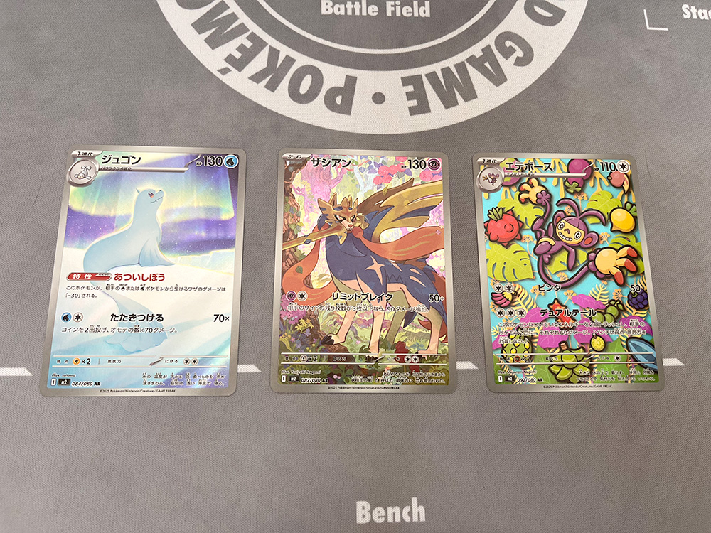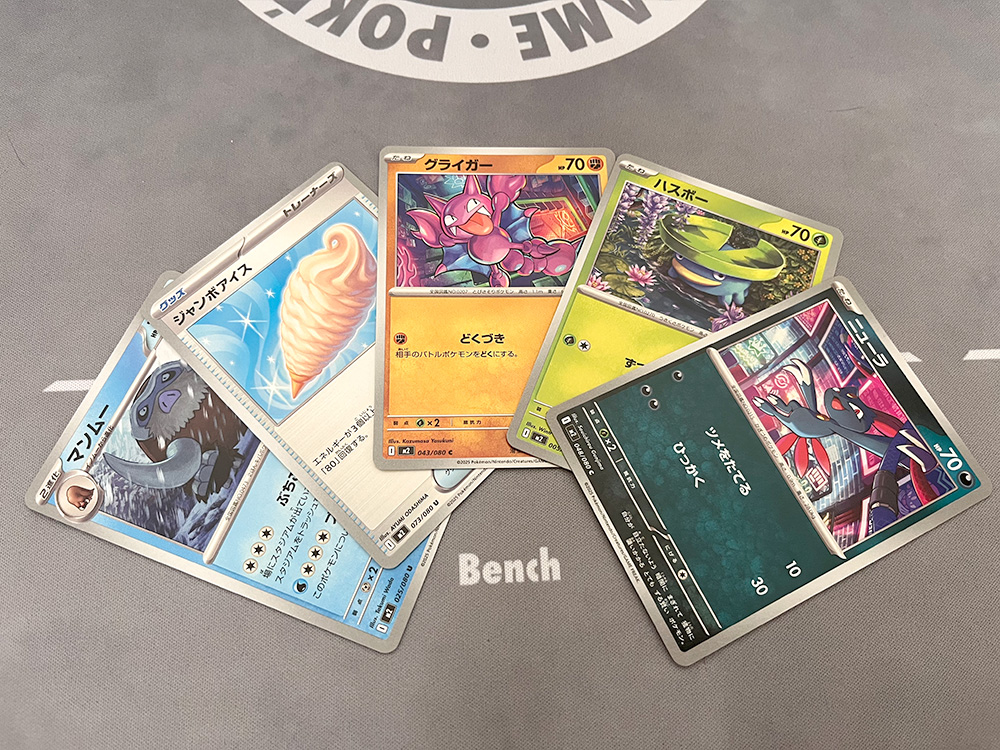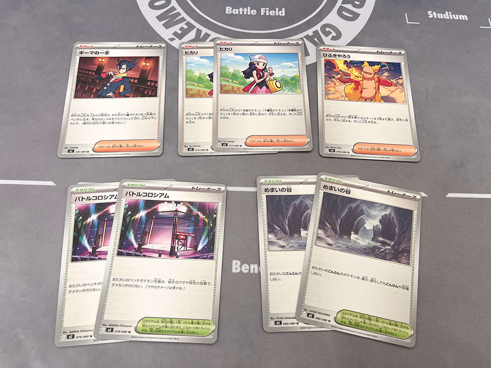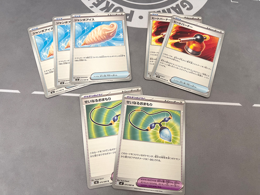 グッズでは「メガガルーラex」や「イシズマイ」などの耐久デッキで活躍する「ジャンボアイス」が3枚、スタジアムではドラパルトexの「ファントムダイブ」や「カーストボム」の効果からベンチを守れる「バトルコロシアム」などを引いています。