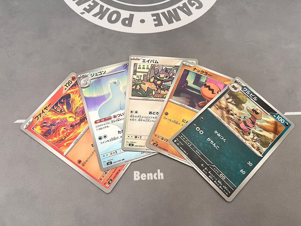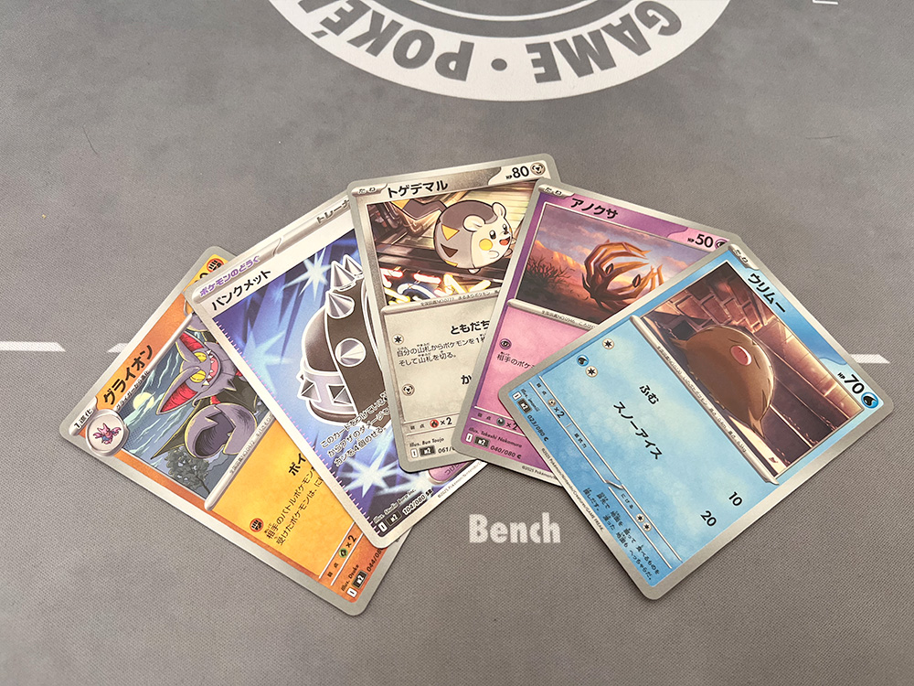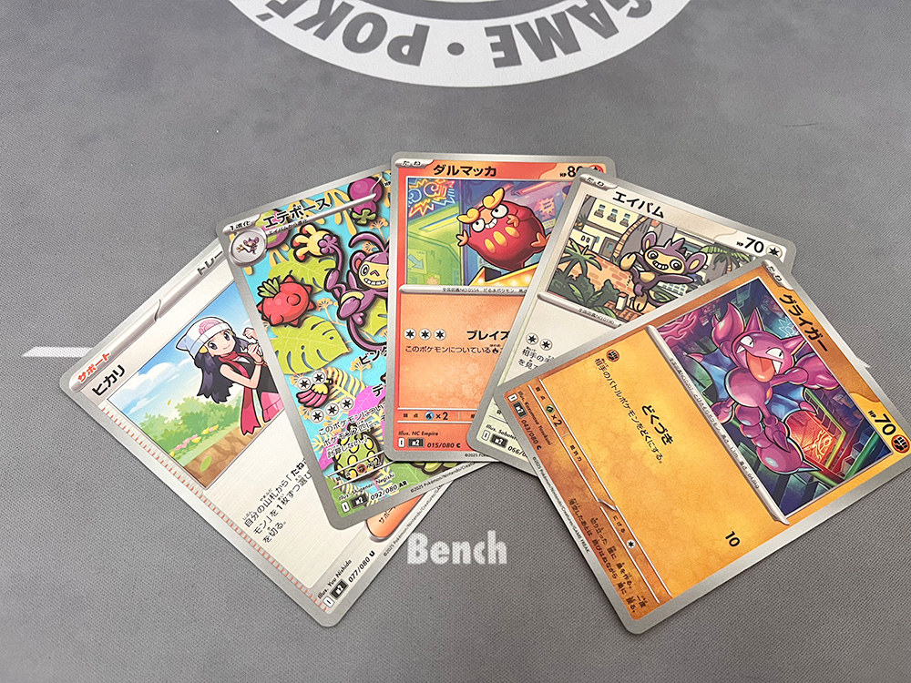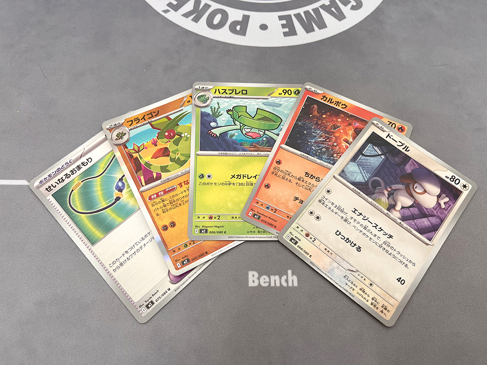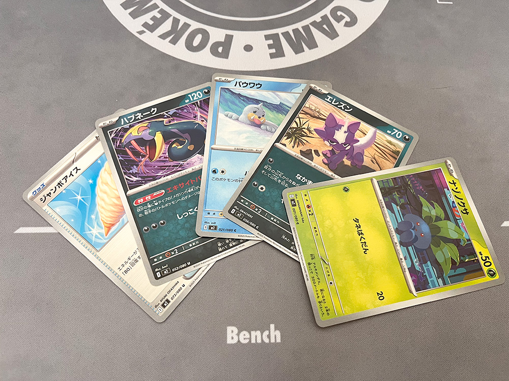 グッズでは「メガガルーラex」や「イシズマイ」などの耐久デッキで活躍する「ジャンボアイス」が3枚、スタジアムではドラパルトexの「ファントムダイブ」や「カーストボム」の効果からベンチを守れる「バトルコロシアム」などを引いています。